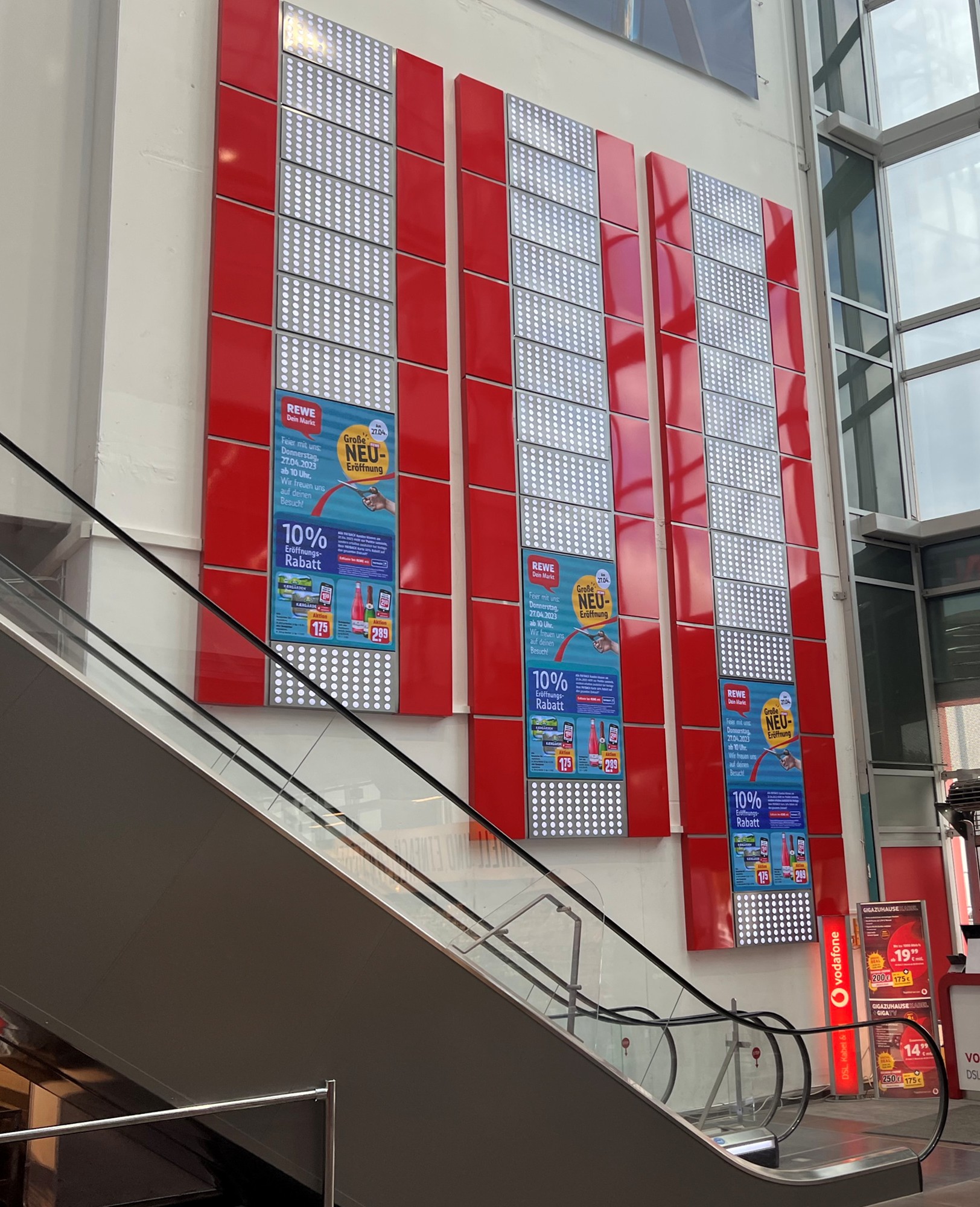 Unsere Videowalls befinden sich in unmittelbarer Nähe zu REWE, MediaMarkt, Crunchfit und Möbel Kraft.